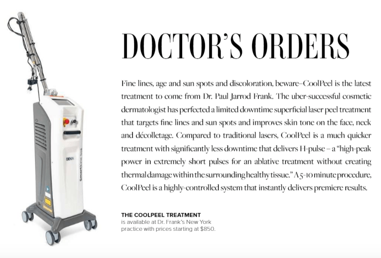 Fine lines, age and sun spots and discoloration, beware – CoolPeel is the latest treatment to come from Dr. Paul Jarrod Frank. The uber-successful cosmetic dermatologist has perfected a limited downtime superficial laser peel treatment that targets fine lines and sun spots and improves skin tone on the face, neck and decolletage. Compared to traditional lasers, CoolPeel is a much quicker treatment with significantly less downtime that delivers H-Pulse – a “high-peak power in extremely short pulses for an ablative treatment without creating thermal damage within the surrounding healthy tissue.” A 5-10 minute procedure, CoolPeel is a highly-controlled system that instantly delivers premiere results.