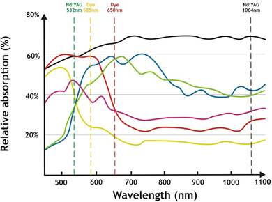 The Synchro QS4 incorporates four independent laser wavelengths to help treat a broad spectrum of tattoo colours: 1064nm, 532nm, 585nm and 650nm. The wavelength selected is determined by the pigment colour (ink) or chromophore, which is delivered to interact and be absorbed by the skin tissue, creating a photo-acoustic effect.